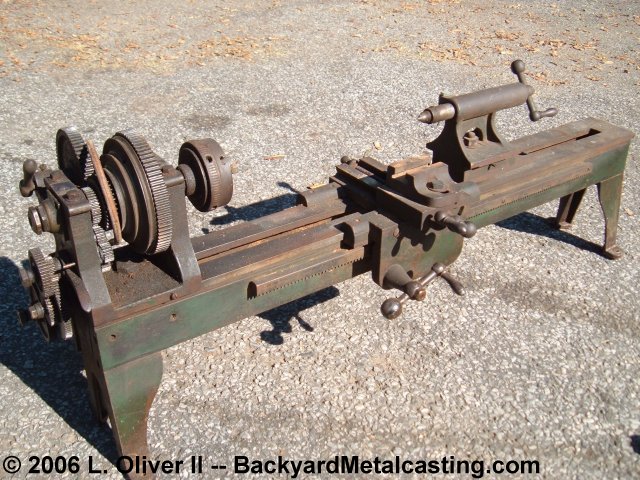 Here is an overall view of the uncleaned lathe. It is about one meter (39 inches) long has a swing of 8-1/4" (4-1/8" center height for the British enthusiasts) and has 22" between centers, or 24" without the chuck on the spindle. I call it an 8 X 20 lathe just to make things easier. The total weight is about 70 pounds. Click photo for larger view |