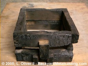 Okay, I was really tired of wooden flasks. Even after taking great care in construction they still ended up burnt and splintered with loose joints and poor alignment. So I decided to cast my flasks from aluminum and rid myself of those troubles! -June/20/2005