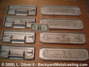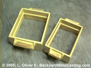 Ok, here you see the wooden flask patterns. They took awhile to build because I'm not much of a woodworker and I was trying to be as precise as possible. The patterns are for; 6" X 9" and 8" X 10" flasks. I also have a 5" X 6" flask pattern but it was built after this photo was taken. I actually built these patterns in 2002 but never got around to successfully making any flasks with them until 2005 when I decided to add this page to the June/20/2005 website update. I guess it took this long because to cast a flask you need and even bigger flask. And most importantly you need to be able to melt a sufficient quantity of metal. I've seen flasks that were cast from patterns made from Styrofoam in the "lost foam" process but it seems like a lot of work to make a pattern for only one use. |
