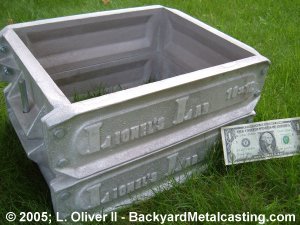 This is an interesting flask type. I've once read that it's called a "Bronze caster's" flask. These are commonly used for jewelry casting. The flask is used while it's standing upright in a vertical position and the metal is actually poured through a "spout" passing through the top wall of the flask. I made this flask for novelty and fun. This flask has inside dimensions of 7" X 10" give or take about 1/8". I think the benefit of it is that the metal falls straight down into the mold cavity ensuring that it fills. This feature is valuable with metals like bronze and brass which can cool before filling a regular style mold. |