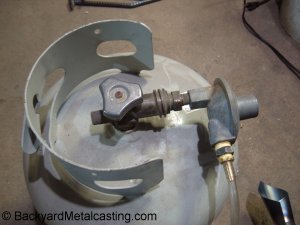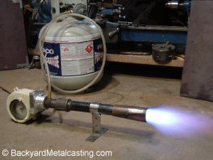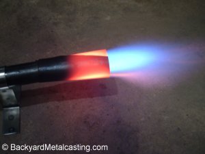 Burner physics and Burning natural gas "Atmospheric" a.k.a. "venturi" a.k.a "self-aspirated" burners are very popular because of the convenience of not needing an air blower and electricity source to power it. But they are also wasteful compared to blown air burners. The typical homemade atmospheric burner requires a high pressure regulator to blast propane through it at over 10 PSI, creating a low pressure zone or "vacuum" in the burner tube to suck in oxygen for combustion. With this high gas pressure far more propane is being blown in than can mix evenly with the air. So it get's wasted and doesn't burn until it exits the vent hole and contacts fresh oxygen creating a pillar of fire. Next thing you know, the propane tank is "freezing up" and running empty after about 5 or 6 melts. This design requirement also makes burning natural gas in an atmospheric burner pretty much impossible. Natural gas such as that supplied to a residence flows at very low pressures, so the forceful jet of gas would not exist and therefore the vacuum effect would not be created and proper functioning would not occur. A blown air burner is different. Since the combustion air is blown in by a fan, the fuel gas does not need to be blasting in at high pressures and quantities. The gas enters at a lower speed giving it more time to burn in the furnace (instead of being wasted as a pillar of fire above the vent hole). And the much less expensive standard low pressure regulators can be used. BONUS INFO: Have you ever wondered why frost forms on the bottom of propane tanks when they run low on gas? Propane is stored in the tank as a liquid. When it is drawn out of the tank rapidly by a burner, energy (heat) is needed to vaporize the liquid propane into a gaseous vapor. When the tank is almost empty the propane vaporizes so quickly that the process creates a refrigeration effect cooling the tank's surface by absorbing heat from the surroundings. So much that moisture in the surrounding air freezes on it's surface creating the "frost" layer.