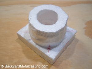 Here's the Styrofoam pattern that I made. It's sloppy but I expect it to do the job. I'll cast this using the lost-foam method. This is where the pattern is buried (and stays) in the sand and the molten metal vaporizes it and fills the void left behind. |