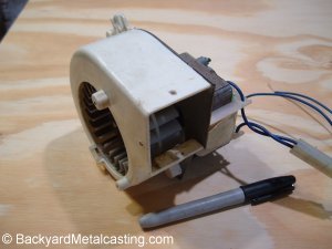 The burner is based on this small "squirrel cage" blower that I bought on Ebay for $16.00 (which includes shipping). And I don't know why they're called "squirrel cage" blowers. This probably came out of some electrical apparatus. It's made by Samsung according to the label. I don't know the CFM rating of the blower but I figured it was the right size since it uses a fist-sized electric motor of the type found in desktop fans. Since the outlet is square I need to fabricate a transition to fit the burner pipe. |