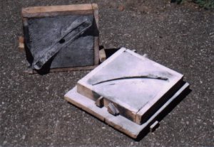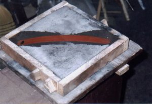 Since the pattern was curved I had to use a method of molding called "coping down" this is where you carve out molding sand until you reveal the parting line of the casting. You can see the sand cut away here in the drag. |