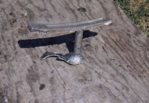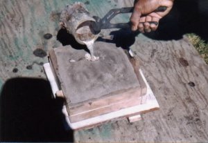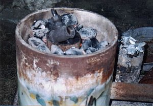 This is the first attempt at casting the incense holder, the metal cooled prematurely. I only used a 3/4-inch sprue so that was part of the problem (too small I think). Also before I poured the metal I was just holding the crucible out of the furnace for about 10 seconds preparing for the picture of the actual pour so that allowed the metal to cool somewhat also. |