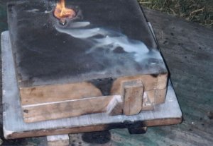 Here you can see smoke and steam escaping through the vent holes. The molding sand I'm using here is homemade greensand (where the steam comes from) mixed with the remainder of my oil bonded sand (the smoke is the remainder of the oil burning out). |
