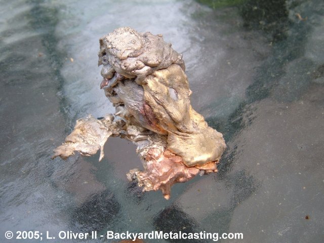 I think this is interesting. Here is some spilled bronze. The bronze spilled out the crucible and into the bottom of the furnace where it drizzled out the drain hole. Notice how the copper has started to separate from the bronze alloy. Maybe this is a result of the other alloying metals burning away or just uneven cooling causing the hotter metal (copper) to cool separately from the lower melting temperature metals. (Click photo for larger view) |