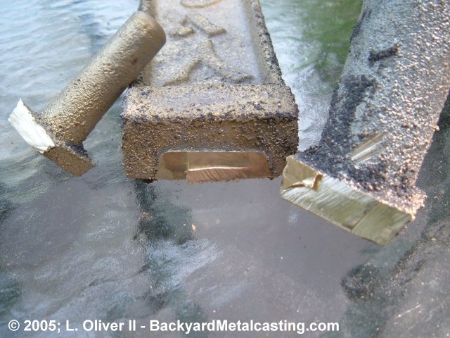 Here is a bronze casting and the cut-off gates. Notice how clean and solid the inside of the casting is. There are no gas pockets nor bubbles. Just clean bronze. The small thing on the left is actually a small riser. It was at the opposite end of the casting as the sprue and was meant just as a steam and air vent. I tried casting this twice without the riser and the mold didn't fill. So I guessed that the steam couldn't escape fast enough from the regular vent holes and cooled the bronze. The sprue solved the problem letting air and steam flow out the mold as metal entered. (Click photo for larger view) |