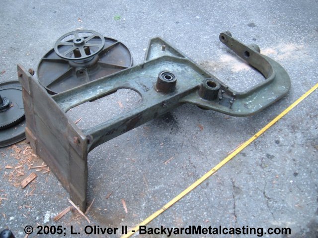 This saw is so heavy that the only way I could get it into the basement was to disassemble it. Maybe it's just the awkward shape and weight distribution but compared to this, my large lathe beds are literally easy to lift. Either way, I also needed to disassemble it so I could remove the old paint, repaint it and clean up the other components as well. -Dec./31/2005