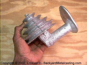 Here is the end result. The pulley came out very nice. You can see part of the core sticking out the top. It's made from a mixture of plaster-of-paris and wood ash. The mix softens when wet and is easily scraped out with a screwdriver. The bore is then cleaned up with the appropriate sized drill bit. |
