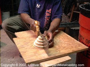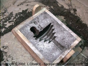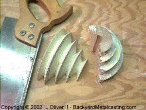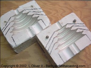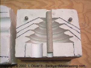 Since the trouble when trying to mold this pattern in sand was that the cavity was damaged whenever I would lift off the cope I figured that I need a safe way to get the pattern to slide out when the cope is lifted. I was contemplating how I might be able to use "follow boards" or "match plates" when suddenly one day while not giving the problem much thought it occurred to me... Split the pattern in half so when the mold is opened half stays in the drag and the other half in the cope then lift the halves out! What took me so long to realize that??! |