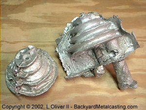 Unfortunately I didn't let the plaster dry enough (I even put it in the oven for a few hours and left it on the fireplace a couple days!) so when I poured the metal, steam formed (sounded like boiling water!) and shot the metal out the mold almost faster than I could pour it in. I kept pouring hoping the steam would finally stop in time to fill the mold completely but heck no. |
