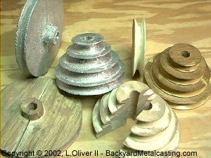 Here is a picture of some pulleys I cast and some pulley patterns I made. The single groove pulley on the left is 6" and is the outboard pulley for the lathe's countershaft. It took about 4 attempts to mold it with the split method but I got it cast properly with only one pour. Once the lathe is far enough along I'll cast more pulleys and clean them up on the lathe. Take a look at making pulleys part 2! |