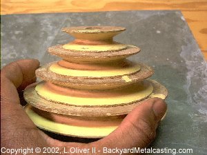 I tried molding the pulleys (the step pulley and 6" pulley) in sand but after the 12th or 13th failed attempt I was ready to put the damn patterns on the countershaft and go with that! However I figured that a plaster mold may allow easy removal of the pattern without serious mold damage and I'd have a reusable mold! The mold came out well! It's pure plaster-of-Paris. Everything is on schedule. |