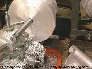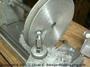Here I'm facing-off the pulley's hub. This side of the pulley took me half the time of the first 'cause I was finally "getting the hang" of using this lathe contraption. |