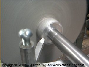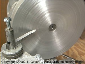 Here you can see I'm a little further along and the actual facing-off is taking place. This tool leaves a fairly rough cut, but then again the book said it was a "roughing out tool." |
