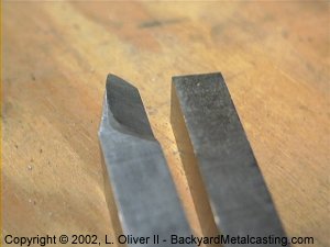Here's a look at my cutting bit. It's a right hand bit ground according to instructions in the book "How to run a lathe" that I got from Lindsay Pubs.. I ground it on an bench grinder using the side of the wheel for most of the work. It looks pretty close to the illustration to me. If anyone has comments or advice about this feel free to e-mail me, thanks. |