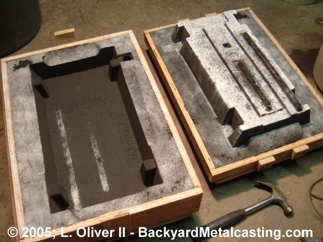 Here is the cope (top half) on the left and the drag (bottom half) on the right. The biggest challenge with this mold was figuring out how to put the cope back on the drag (to close the mold) without the sand falling out. Sure I have ridges in the flask to help but when the cope weighs about 75 pounds they don't help as much as I'd like. The sand would often pull away from the long sides of the mold as I tilted the cope over. I solved the problem by pushing nails into the sand. The nails provided sufficient anchorage to keep the sand in place long enough for me to reinstall the cope. It took me about 4 tries before I got a successful mold. Click photo for larger view |