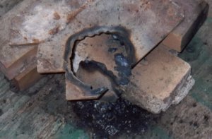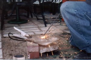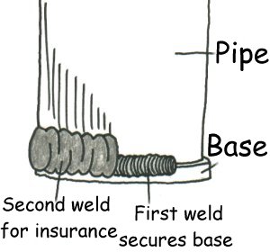 This is the way I weld the base to the pipe. I first tack weld it at several places, then I go around it with the first weld to secure the base firmly. Next I use a "weaving" pattern with the electrode to create a wide strong connection to ensure the crucible's integrity. Initially I didn't put the second weld on my first crucible and somehow the single weld split. Now I spend the extra time on all of them I make. |