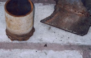 I start with a piece of iron pipe the diameter I want the crucible to be. I found this piece with several others discarded at an industrial renovation site. There's also a steel plate from which disks used for the base are cut from. If you look closely you may be able to tell that the plate is actually welded together from three smaller plates. Yes I did that! |