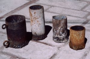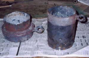 This is the last stop on our crucible making tour. Here you can see my four crucibles and of course the modified version of my old standby. Its now six inches tall and I like it a lot better now. I plan to use the shortest one for brass only. |