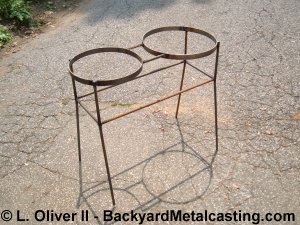Next I welded on the rings that would keep the pots in position in the framework. They were rolled from flat steel strap. Notice that I also bent the legs outward a bit for more stability and better looks. |