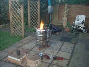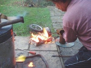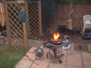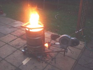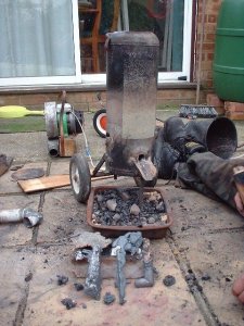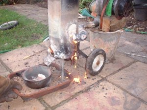 The other pics show my present furnace (although it has been modified a lot since) "batch melting" iron using coke. This was the first attempt which was a complete success (that surprised the hell out of me!!). I decided the cupola was too small and fiddley and gave it away (it melted around 6-7 lbs per charge) but it was fun. Batch melting in the other one although working well is very hard on the lining (it has cracked in a few places, probably due to the thermal shock caused by knocking the bottom out when very hot and the cold air rushing in the bottom as the hot air shoots out the top). Around 20lbs. of iron seems about max. with the bed height. |