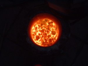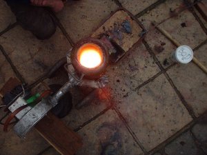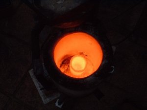 I find I can get the iron in a crucible to a "spongey" state where it settles to the bottom of the crucible and can be topped up, on waste oil. I then use diesel to bring it up to pouring temp. Here is a picture showing the white crucible/red furnace lining to demonstrate my need for insulation. |