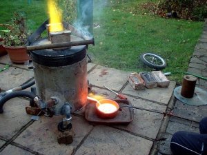 In England the term "Backyard" is translated as "backgarden" and Colin is doing some serious Backgarden Metalcasting! He has designed and built some very effective miniature cupola furnaces and they're just dripping (literally!) with molten iron. He even melts iron in a crucible using coal for fuel! Enough said, onto the photos!