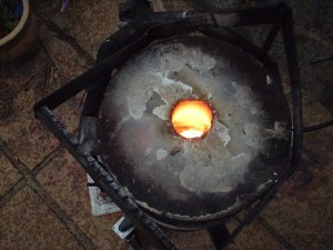 Here is one of burning cooking oil melting alli. The interest in furnaces came about to improve the range of engines I could make with my hobby of model engineering, however I now realize that the possibilities are almost endless. I have cast a few parts for my boat with plans to make many more as I "fix her up." A Gingery shaper is on the cards as well. I don't at this stage think I will need to melt more than 20-25lbs. of iron so my present set up is fine. I can melt a gallon container of alli, brass or bronze with oil. |