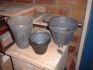 Some cast iron crucibles I have started making. These use flower pots for the pattern and a couple of pieces of doweling placed in the sand to give lugs if wanted. The tongue at the bottom is to grip to pour. |