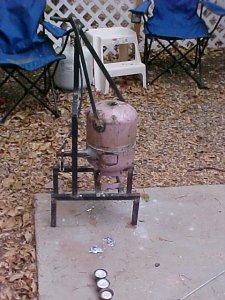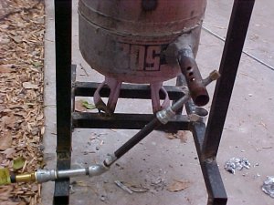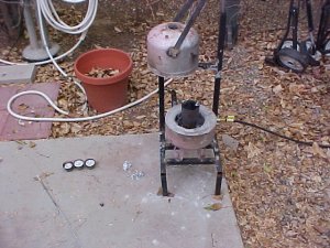 The burner is made from plans straight from your website. So far when I heat the melt it has not burned the paint off the outside. One of the articles on the net indicated that when the lid of the furnace was set on the holder the burner hose got much too hot and melted. So I turn my fuel feed tube down at 45 degrees and away from the lid, this seems to work fine. |