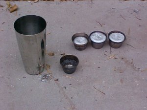 For a "crucible" I picked up a stainless steel milkshake cup from a nationally known warehouse store. Little ingot molds are stainless steel garnish cups from a "dollar" store. |
