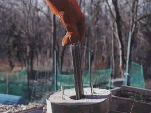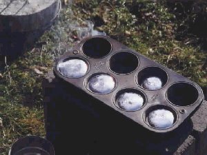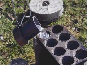 Starting the pour. Note I have since changed the crucible design to Lionel's- with lifting lugs on the top rim, and a pour spout. Hooks are too hard to balance a full crucible. |