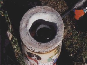 Overall view of the furnace. Note the date on the lid- the date I started this furnace madness ;-) The Reil 3/4" burner is inserted in the old air blast hole at an angle. The former flowerpot is now entombed in refractory material. |