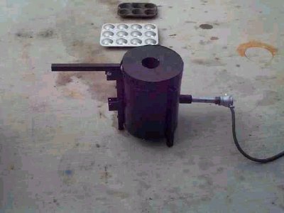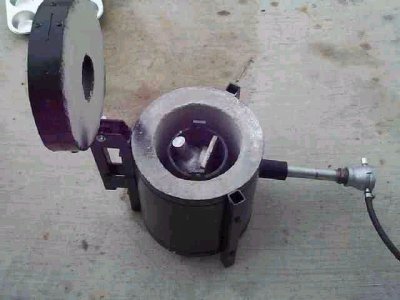"The furnace is made with a popcorn can, which I discovered on my own, later to find others had discovered as well. You can get empty five gallon cans from industrial paint suppliers though. The lid is hinged, don't need to set it down anywhere. The lining is about 2 inch thick Firecast F80, a commercial lining. It uses a Reil type burner." |