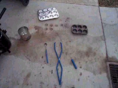 "Here are some tools: tongs, skimmer, a pouring hook, and some muffin tins I am making ingots in." |