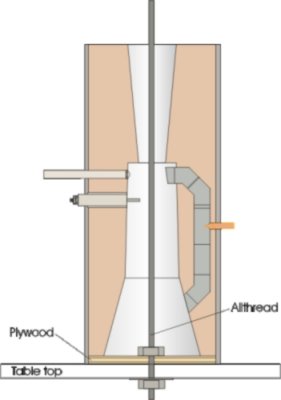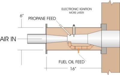 1) I had a piece of 6" cardboard tube to use for the OD of the burner. I cut it down to 16 ½" and cut a ½" plywood plug to fit the ID of the tube drilled a 3/8" hole in the center. I will send a little drawing, I went to the craft store and bought 2 of those white foam cones used for silk flowers 1 at 8" & 1 at 12" I then measured the drawing and made the 3 sections of the inside of the burner. I used 15 degrees for the final nozzle. I then covered the foam plug with adhesive back aluminum tape as found in the hardware store. This allowed me to semi-burnish it when covered making the inside of the burner smoother than the foam could. I took the foam plug and center drilled a ¼" hole down the center lengthwise and pushed it down the all-thread inside of the tube. I then fastened the other parts to the foam. The oil feed tube is ½" conduit (steel) with a .040 welding tip in the end of the 1/8" nipple. The propane injector has a .23" orifice. The ignition electrodes are S.S. units I bought from Johnstone supply (for rebuilding oil burners). |