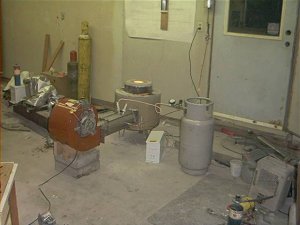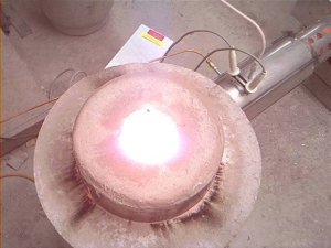 2) I pre-cured the refractory along with my furnace. I placed the burner on end over the vent in the lid and placed a 90 watt hotplate in the belly of the furnace. This unit kept the whole thing at 104deg for 15 days (not by choice). 3) The electronic ignition is a 12,000 Volt 60 Milliamp neon sign transformer The unit can be had from any electric sign shop or supply house. Ask first for a non-UL-2161gfp, as all non-protected units are now illegal. They should be nice and help you with a used or out of date unit. NOTE: 12,000 volts will produce an arc (Corona) 2" long getting bit is no fun!!!!!!!!!!!! But safe if used with common sense. If you have questions with this you can post to the forum at Lionel’s site. Here are a few pics of the 3rd firing of my furnace. No spalling whatsoever!!!!!!! |