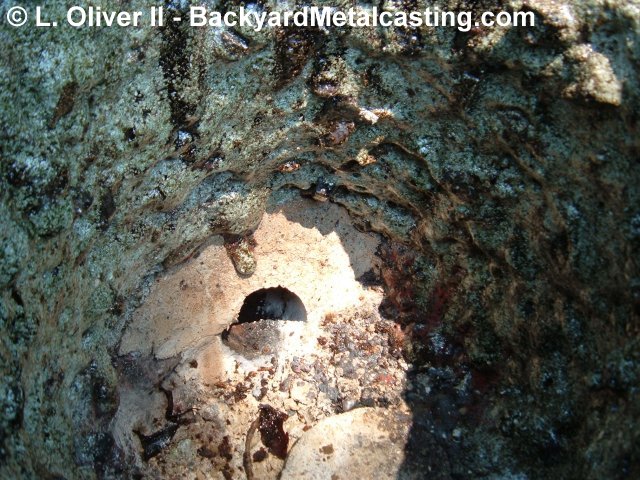 Here is the patched burner entrance hole looking at it from inside the furnace. This is the day after the melt. The patched area is in very good condition. Surprisingly the new refractory is not glazed. Possibly because in the refractory for this patch I used "type 3" portland cement which is the fast setting type. It has a higher alumina content making it more heat resistant. And speaking of cement, I've read comments where people have said the cement in the homemade furnace refractory serves no purpose. Incorrect! I put it in to harden the refractory quicker thereby reducing shrinkage. (Click the photo for a larger view). |