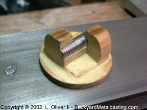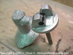 Here's the splitnut as it looked fresh out the sand after a little filing. I got my pot metal to cast this part from the casings of some vacuum cleaner motors I dismantled. I threw a few aluminum lawn chair tubes in the pot also. Now I need to cut the fillets away, remove the core and cleanup the resulting threads with a tap. |