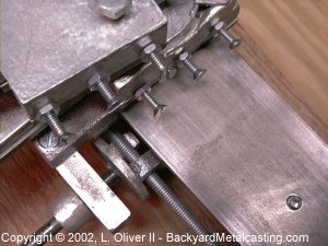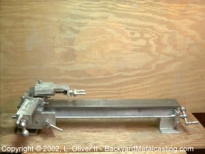 As soon as you finish the carriage assembly progress really picks up speed. At this point most of the hard and tedious work is done. This page is on the finished leadscrew assembly. The leadscrew moves the carriage assembly along the ways side to side. All I have to do now is build the countershaft (motor mount) and the lathe will be able to start cutting and turning (to bore the headstock pattern)! The head and tail stock and faceplate patterns are the only ones left to build. Thank goodness... |