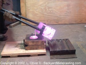 Here I am pouring the splitnut casting in my baby flask. This is metal from another run in part 3 of the "2 bucks" furnace adventure. |
