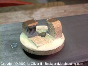Here is the finished splitnut pattern with steel core (to leave threads in the sand for the piece of threaded rod that is set in the mold) in place and the fillets all done and smooth. Make the fillets as small as possible because they need to be cut, chiseled and all out filed away to get the threaded core out the casting. |