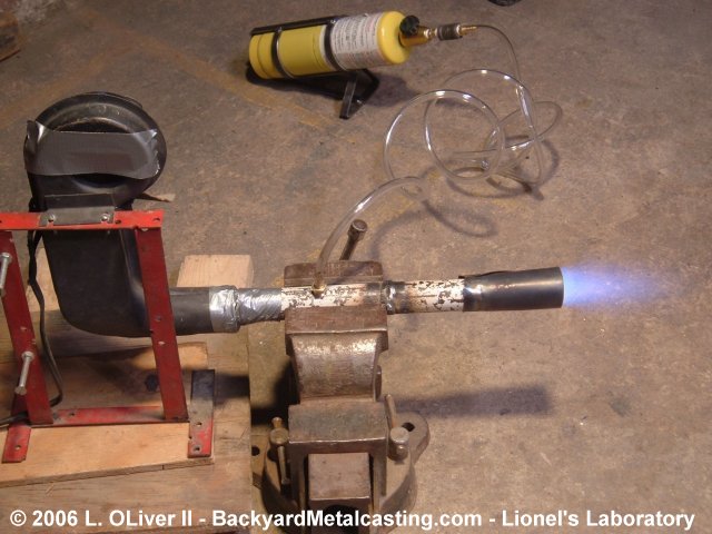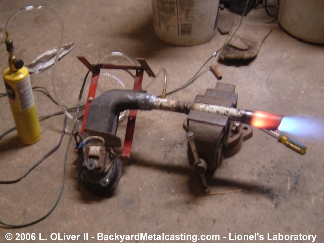 Here is a photo of the first run of the test burner. The burner is a scrap of old steel pipe. It's held in a vise and has a raggedy sheetmetal flare on the end of it. The flare is needed just like on a "self-aspirated" burner. The valve on the MAPP® gas tank must be completely open to produce sufficient fuel flow. The blower is the same blower I used for my charcoal furnace when I first began metalcasting. This dirt cheap rig proved the concept works! This is a 1" burner pipe but the flame was similar to a 3/4" venturi burner flame. Click photo for a larger view |