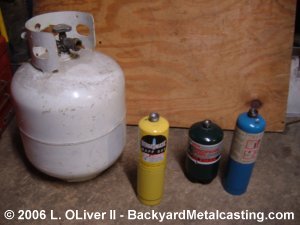 This is a comparison photo of some common gaseous fuels. On the left is the typical barbecue grill type propane tank. The popular "self-aspirated" a.k.a. "atmospheric" a.k.a. "venturi" burners require the propane capacity and pressure that these tanks put out. They also require a high pressure regulator. The yellow tank is a disposable MAPP gas tank. These are often used in place of propane in hand held plumbing soldering torches. On the right is a typical short propane tank and next to it is the taller version. Both are disposed of when empty. I have not tried these small tanks with an atmospheric burner but it seems to me that they are more suited to a "forced-air" burner because of their smaller gas quantity. |