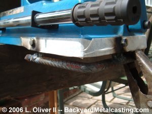 I next bent two "U" shaped pieces of rebar. They were not truly "U" shaped because they have flat, not curved bottoms. I welded three flanges to the bracket in alignment with the bolt holes. This finished assembly is what holds the saw to the base. |
