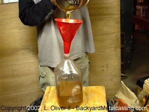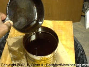 I collect used cooking oil by pouring it into a steel can straight from the frying pan. Every time some fish or chicken is fried I pour the oil into this can and store it. The bits of fish, french fry etc. settle to the bottom and I can pour off relatively clean oil. Any well used cooking oil will do. For those who demand the best for their foundry I suggest extra virgin olive oil imported from Italy or Greece. |