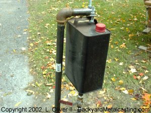 Here's a quick look at the fuel tank. It's nothing more than a 1-gallon steel can that I attached a threaded fitting to the bottom of leading to the fuel line. The tank is hanging from a fixture made from a steel pipe. Gravity feeds the oil into the burner and valves regulate it. |